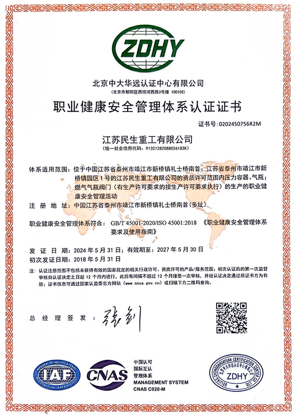 ISO45001職業(yè)健康安全管理體系認證證書