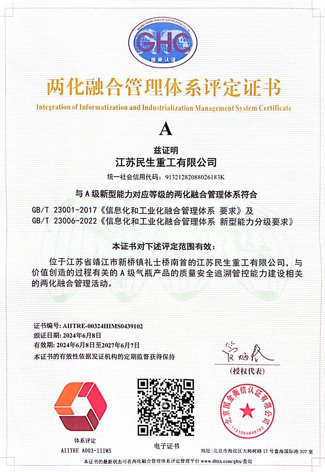 兩化融合管理體系評定證書
