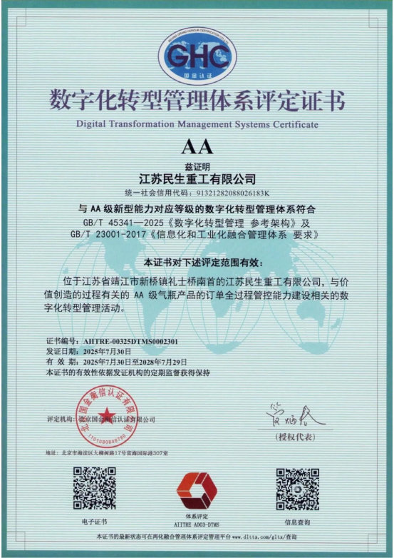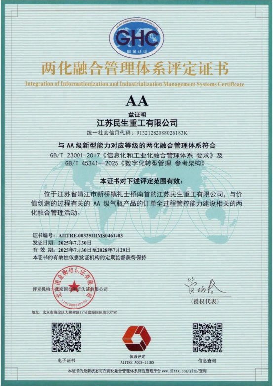 江蘇民生重工有限公司榮獲“兩化融合管理體系”AA級(jí)評(píng)定